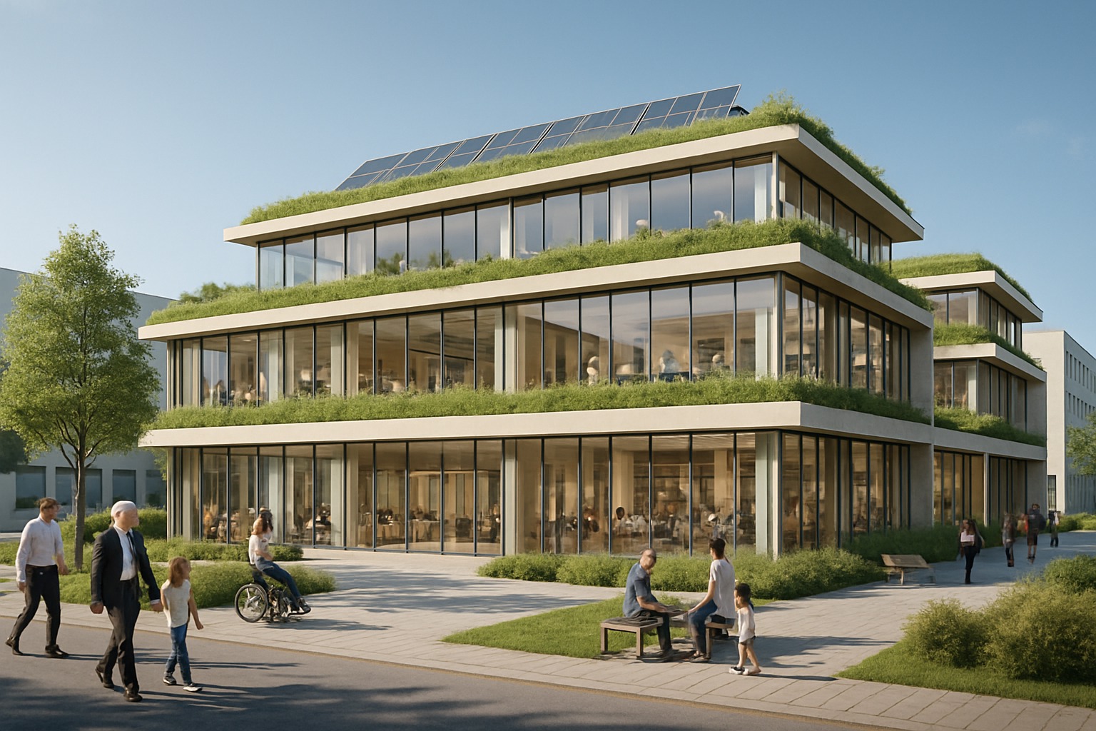 Der Campus ist ESG-konform, energieeffizient und sozial nachhaltig – ausgestattet mit Photovoltaik, Dachbegrünung und digitalem Energiemanagement.